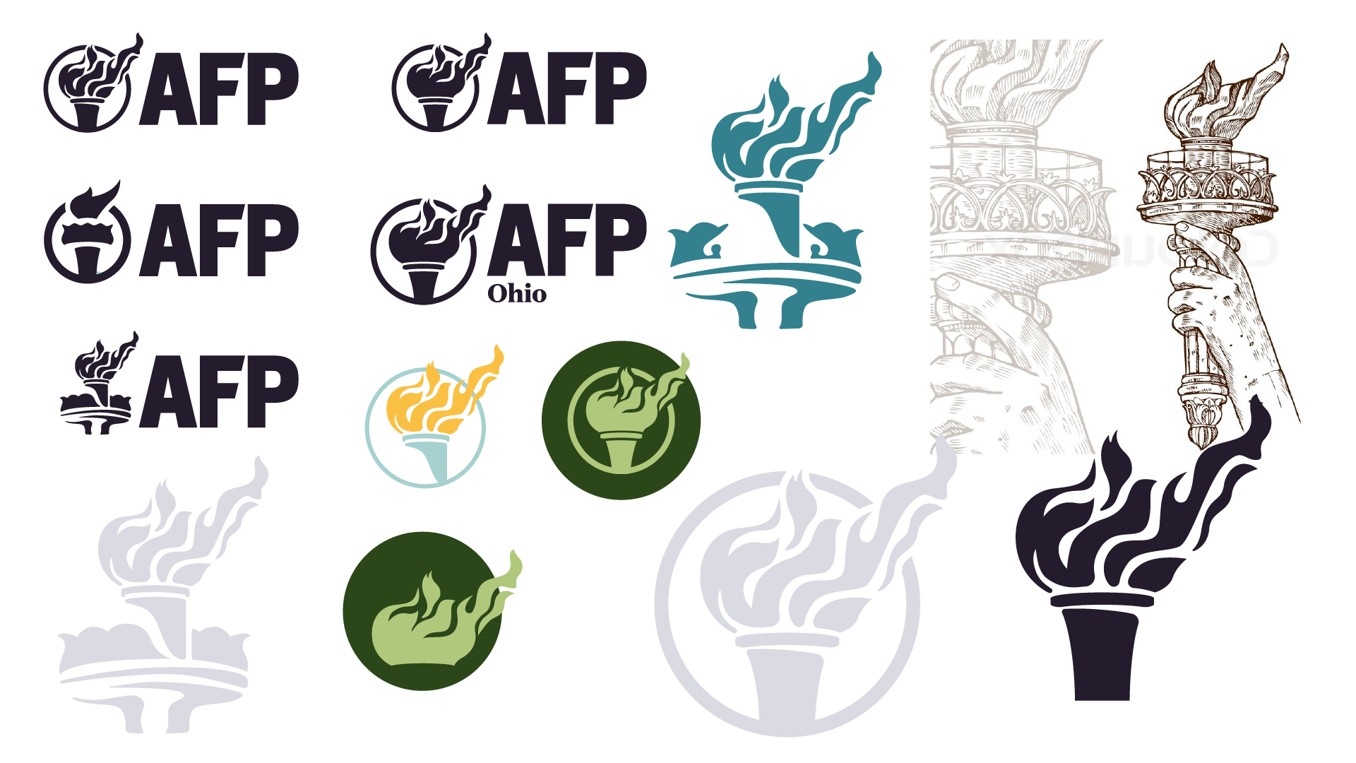 AFP stakeholders wanted to keep “The Torch” a primary component of their new visual identity. Given its tie to the Statue of Liberty, I decide to start searching for inspiration there. I purchased Ken Burns’ 1985 documentary The Statue of Liberty and set out to learn a bit more about Lady Liberty and her history. This was an obvious direction given Lady Liberty’s torch, but as a metaphor for ideation, connectivity, creativity, communication, and truth, it became even more compelling.